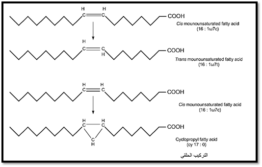 اما الحوامض الدهنية الحلقية Cyclopropyl fatty acids مثل Cy19: 0 , Cy17 : 0 فتزداد نسبتها بشكل مرافق لزيادة النظير Trans على حساب النظير Cis تحت أكثر ظروف الاجهاد المذكور اعلاه، اضافة الى حصول الزيادة عند استعمال المبيدات والاجهادات الميكانيكية المتمثلة بحراثة التربة كما موضح في الجدول (3).