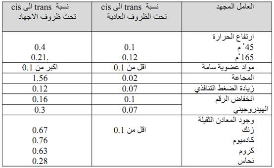 وتؤدي المركبات العضوية السامة وزيادة الضغط التنافذي الى زيادة النظير Trans في دهون البكتريا التي تعد نموذجا دراسيا لمثل هذه الاغراض وهي Ps. Putida .