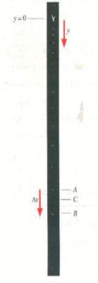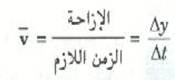 من الواضح أن أتجاه السرعة هنا رأسي إلى أسفل لأنه هو نفس اتجاه الحركة. ولإيجاد قيمة تقريبية لمقدار سرعة الكرة عند C يمكننا حساب السرعة المتوسطة بين النقطتين A و B . لنسمي إحداثي قياس موضع الكرة y. إذن ، عندما تنتقل الكرة من A إلى B تكون إزاحتها yΔ. وحيث ان tΔ هو الزمن بين ومضتين متتاليتين من الضوء فإن الزمن الذي تستغرقه الكرة للانتقال من A إلى B يكون أيضاً tΔ. وعليه ، فمتوسط سرعة الكرة في المنطقة من A إلى B هو: