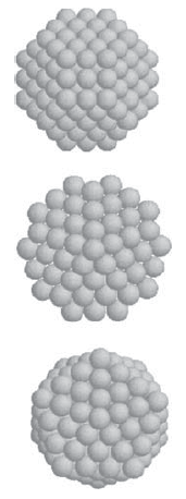 These calculations show that for very small sizes the icosahedron is the most stable shape. This result is easy to understand, because it is the most compact shape: it maximises the binding energy by having a shape very close to spherical and it exposes only facets which have the lowest surface energy. However, this structure is not a crystal structure. It cannot therefore extend to macroscopic crystals. In an icosahedron, the central atoms are subject to a very high degree of compression, whilst the surface atoms are relaxed.