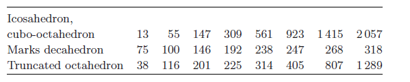 Table 1.1. Magic numbers for different clusters: icosahedron, cubo-octahedron, truncated (Marks) decahedron, and truncated octahedron (Wulff polyhedron for an fcc crystal)