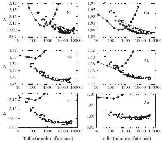 If an icosahedron is made to grow, the energy related to these stresses becomes too large compared with the gain in compactness and the structure tends to the normal one, i.e., fcc in this case. Figure 2 shows the stability diagrams of copper, silver, gold, nickel, palladium and platinum clusters up to 50,000 atoms .