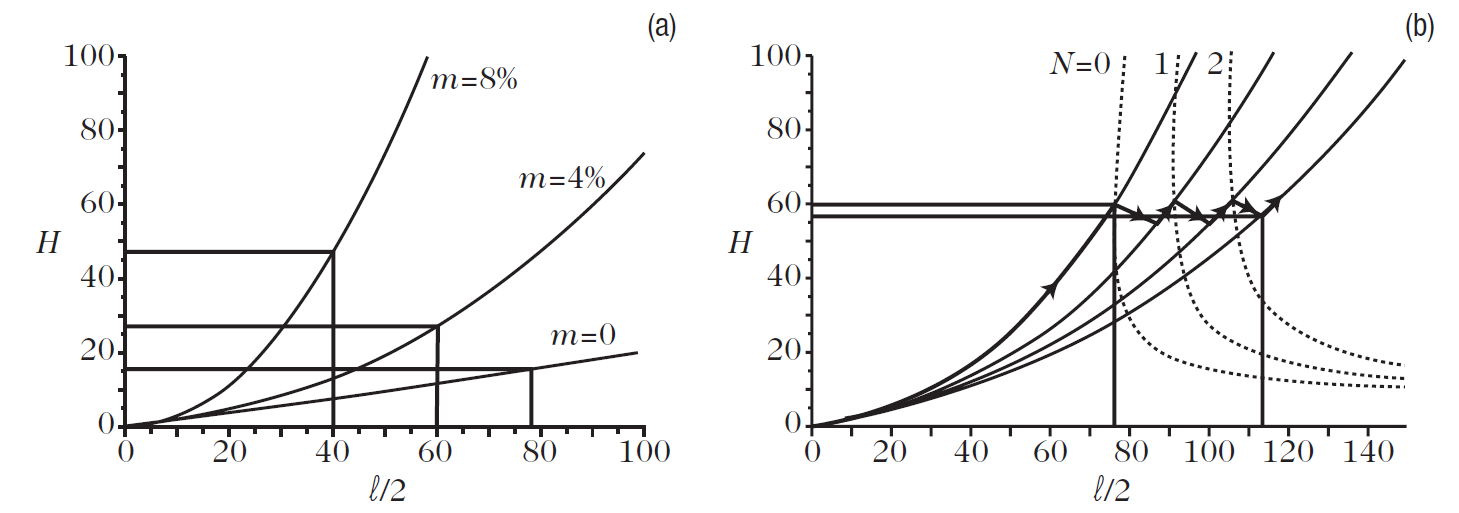 For perfect lattice matching (m = 0), we obtain a straight line (see Fig. 1. a), which indicates that the aspect ratio (the ratio H/l of the height to the size) is constant, i.e., the equilibrium shape is independent of the size.