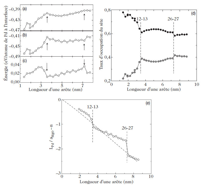 Fig. 3. Adhesion energy (expressed by negative values in the calculation) and occupation of oxygen sites on the surface as a function of the size of the Pd cluster supported on MgO (100). The adhesion energy (a) has two parts: the contribution from Pd–MgO bonds (b) and the contribution from Pd–Pd bonds at the interface (c). The occupation percentage of oxygen sites (black circles) and magnesium sites (stars) is shown in (d). The variation of the epitaxy parameter LPd/aMgO − n between the Pd and MgO lattices at the interfaces is shown in (e). It is equal to zero if all the Pd atoms are above oxygen sites (coherent epitaxy) and decreases linearly (dotted curve) for an incommensurable interface. Taken from Vervisch et al. [3]