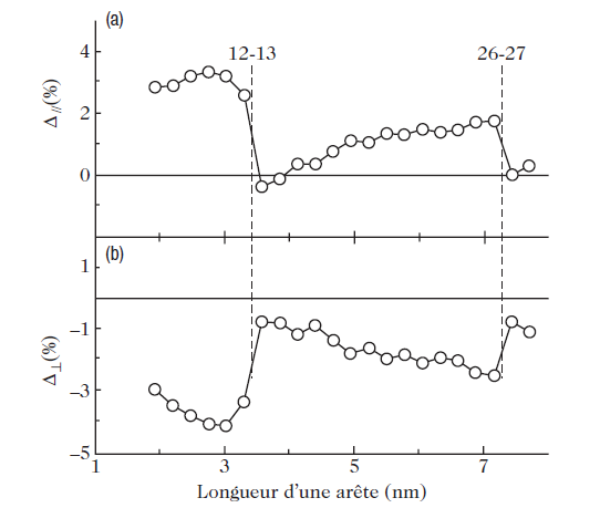 Moreover, the greater the lattice mismatch, the more the aspect ratio will increase. This result can be understood quite simply from the fact that the crystal tries to reduce the stresses, localised near the interface, by reducing the area of that interface. However, when the size of the crystal increases, the stored elastic energy increases and, at some point, it becomes more economical energywise to undergo plastic relaxation by creating dislocations.