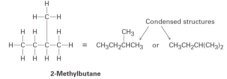 In the structures we’ve been drawing until now, a line between atoms has represented the two electrons in a covalent bond. Drawing every bond and every atom is tedious, however, so chemists have devised several shorthand ways for writing structures. In condensed structures, carbon–hydrogen and carbon– carbon single bonds aren’t shown; instead, they’re understood. If a carbon has three hydrogens bonded to it, we write CH3; if a carbon has two hydrogens bonded to it, we write CH2; and so on. The compound called 2-methylbutane, for example, is written as follows:
