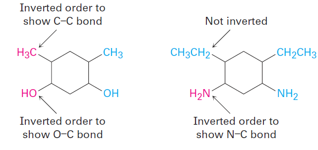 One further comment: although such groupings as –CH3, –OH, and –NH2 are usually written with the C, O, or N atom first and the H atom second, the order of writing is sometimes inverted to H3C– , HO– , and H2N– if needed to make the bonding connections in a molecule clearer. Larger units such as –CH2CH3 are not inverted, though; we don’t write H3CH2C– because it would be confusing. There are, however, no well-defined rules that cover all cases; it’s largely a matter of preference.