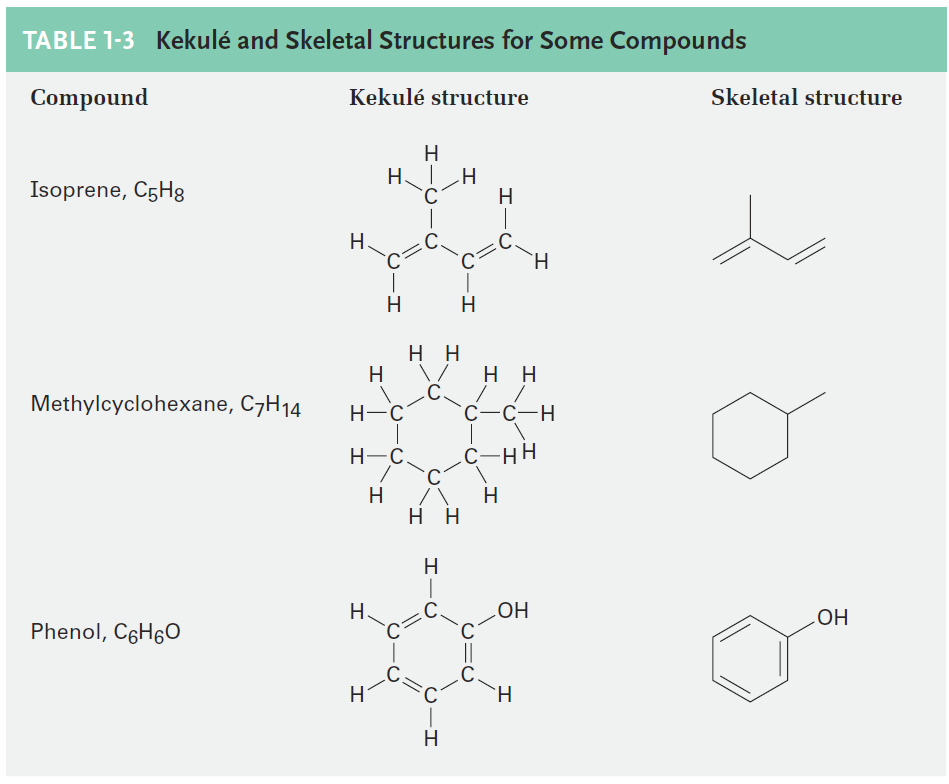 Even simpler than condensed structures are skeletal structures such as those shown in Table 1-3. The rules for drawing skeletal structures are straightforward.