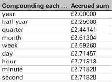 Will our money increase beyond all bounds and make us a millionaires? If we keep dividing the year up into smaller and smaller units, as shown in the table, this ‘limiting process’ shows that the amount appears to be settling down to a constant number. Of course, the only realistic compounding period is per day (and this is what banks do). The mathematical message is that this limit, which mathematicians call e, is the amount £1 grows to if compounding takes place continuously. Is this a good thing or a bad thing? You know the answer: if you are saving, ‘yes’; if you owe money, ‘no’. It’s a matter of ‘e-learning’.