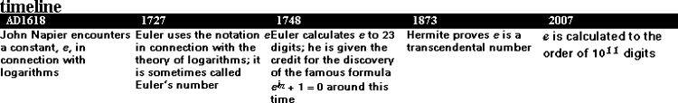 e is the new kid on the block when compared with its only rival π . While π is more august and has a grand past dating back to the Babylonians, e is not so weighed down by the barnacles of history. The constant e is youthful and vibrant and is ever present when ‘growth’ is involved. Whether it’s populations, money or other physical quantities, growth invariably involves e.