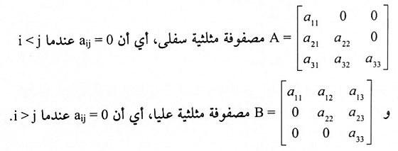 تسمى المصفوفة المربعة التي جميع عناصرها فوق القطر الرئيسي تساوي صفر بالمصفوفة المثلثية السفلى. اما التي جميع عناصرها أسفل القطر الرئيسي تساوي صفر فتسمى المصفوفة المثلثية العليا.