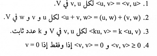 الضرب الداخلي على V هو دالة ترفق العدد الحقيقي <u,v> مع زوج من المتجهات v, u في V بطريقة بحيث تتحقق الشروط الآتية: