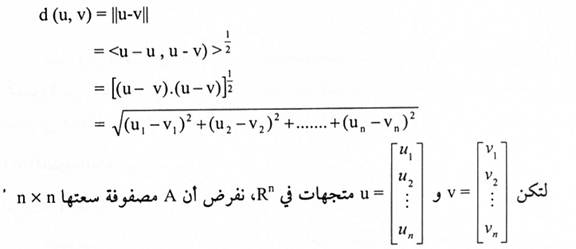 أما المسافة بين المتجهين u,v ، تكتب d(v , u) ، فتعرف