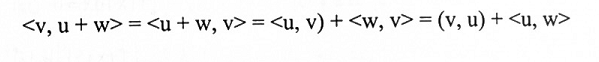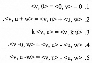 لتكن w, u, v ثلاث متجهات في فضاء الضرب الداخلي الحقيقي و k كمية ثابتة، فإن