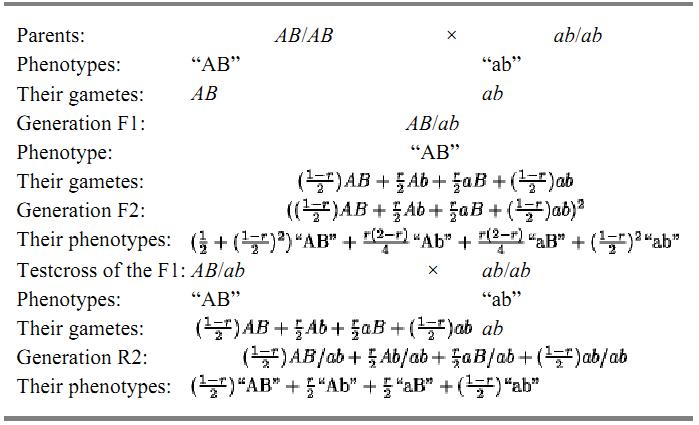 Linkage disturbs Mendelian segregations as shown in Table 1. The relationship between the recombination frequency and the observed phenotype frequencies is rather complicated in the case of an F2 generation, but relatively simple in a test cross of F1 individuals with tester individuals that are homozygous for the recessive alleles at all the loci under consideration.