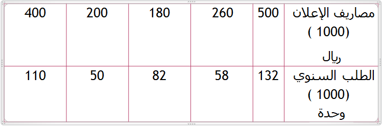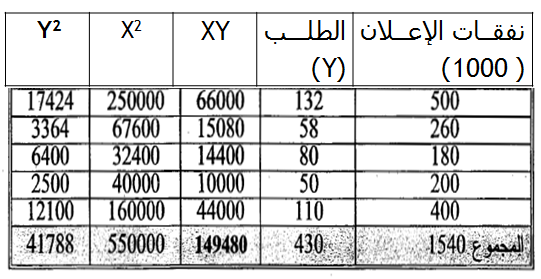 الحل: (y) هو المتغير التابع وأن مصاريف الإعلان (×) هي المتغير المستقل