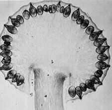 شكل (4) وسادة هيفية تتكون من هيفات مندمجة من ميسليوم الفطر وتحمل على سطحها الاجسام الثمرية دورقيه الشكل مطمورة داخلها.