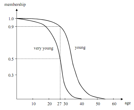 the fuzzy set of "young is 1. Also that of "age twenty seven" is 0.9. But we might not say young to a person who is over sixty and the possibility of