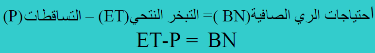 إذا اعتبرنا أنه لا يوجد سيلان في نظام ري جيد التخطيط (0=R) ولا يحدث فيه الرشح في العمق (0=D) فإن كمية الماء التي يحتاج إليها المزروع والتي سيمده بها الري أو بتعبير آخر، الاحتياجات الصافية (Besoins Nets) للري (BN)، تساوي الفرق بين ما يضيعه الثنائي التربة والمزروع، بسبب التبخر النتحي (ET)، وما يصل من ماء عبر التساقطات (P).