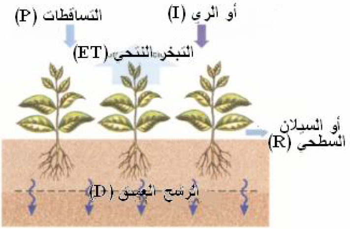 إن الماء يدخل ويخرج في النظام المكون من التربة كخزان للماء والمزروع كمستهلك للماء، والفرق الحاصل في كمية الماء التي تدخل والكمية التي تخرج تساوي تغيرات رطوبة التربة.