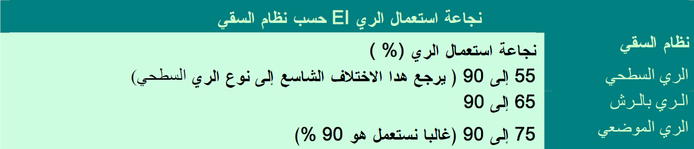 تجدر الإشارة إلى مفهوم نجاعة استعمال الري Efficience d’Irrigation (EI)) و الذي يعني نسبة الماء المستغل من طرف الجذور مقسومة على كمية الماء المسخر للسقي ويعبر عنها بنسبة مئوية. تختلف هذه النسبة اختلافا كبيرا حسب نظام السقي كما يبدو في الجدول أسفله.