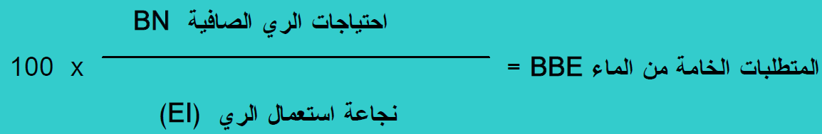 إذا كانت احتياجات الري الصافية BN تساوي 50 مم ونجاعة استعمال الري EI تساوي 85%, المتطلبات الخامة من الماء x 100 = BBE) 85/ 50= 58.9 مم
