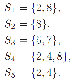 The family X1 = {S1,S2,S3,S4} does have an SDR, namely {2, 8, 7, 4}.The family X2 = {S1,S2,S4,S5} does not have an SDR.