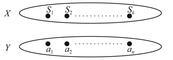 We now construct a bipartite graph with partite sets X = {S1,...,Sk} and Y = {a1,...,an} (Figure 1.7). We place an edge between Si and aj if and only if aj ∈ Si.