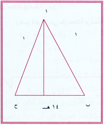 فرض الخوارزمي مثلثا طول اضلاعه : 15، 14، 13، وتوخى حساب مساحته كما يلي :