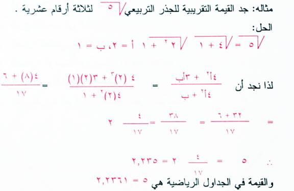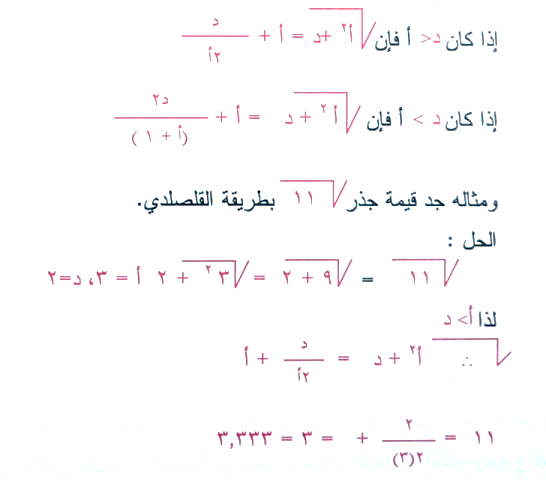اما قيمة الجذر التربيعي التقريبي من الجداول الرياضية فهو 3.3166 وقد اعطى القلصادي قيمة تقريبية للجذر التربيعي للكمية (أ2 + ب)، والقيمة هي ك، واستعملها كل من الايطاليين ليوناردو اوف بيزا وتارتاليا وغيرهما لإيجاد القيمة التقريبية للجذر الصم.