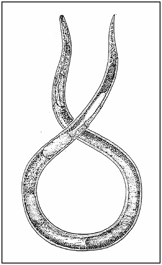 أنثى ناضجة. لاحظ الكيس الرحمي الممتد للخلف، والحجم الصغير للرمح.