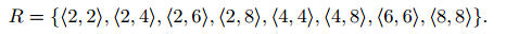 R = {(1, 2),(1, 3), .. . ,(1, 6),(2, 4),(2, 6),(3, 6)},