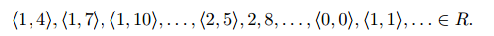 4. Let A = R, and define R on R by xRy iff x · y = 1. Then R consists of all pairs 〈x, 1/x〉, where x is non-zero real number.