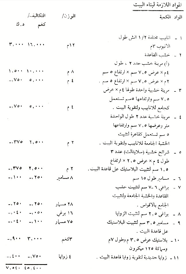 ان البيت البلاستيكي المتنقل سهل البناء والادارة يمكن بناؤه بتكاليف قليلة طول البيت اربعة أمتار وعرضه متران اما ارتفاعه فمتر واحد وهيكل البيت مقوسي ليمنع تراكم الاوساخ والامطار ويكلف بناؤه ۷-۸ دينار ويزن حوال كليو غراما وبعد انتهاء الموسم يمكن فك البيت وخزنه.