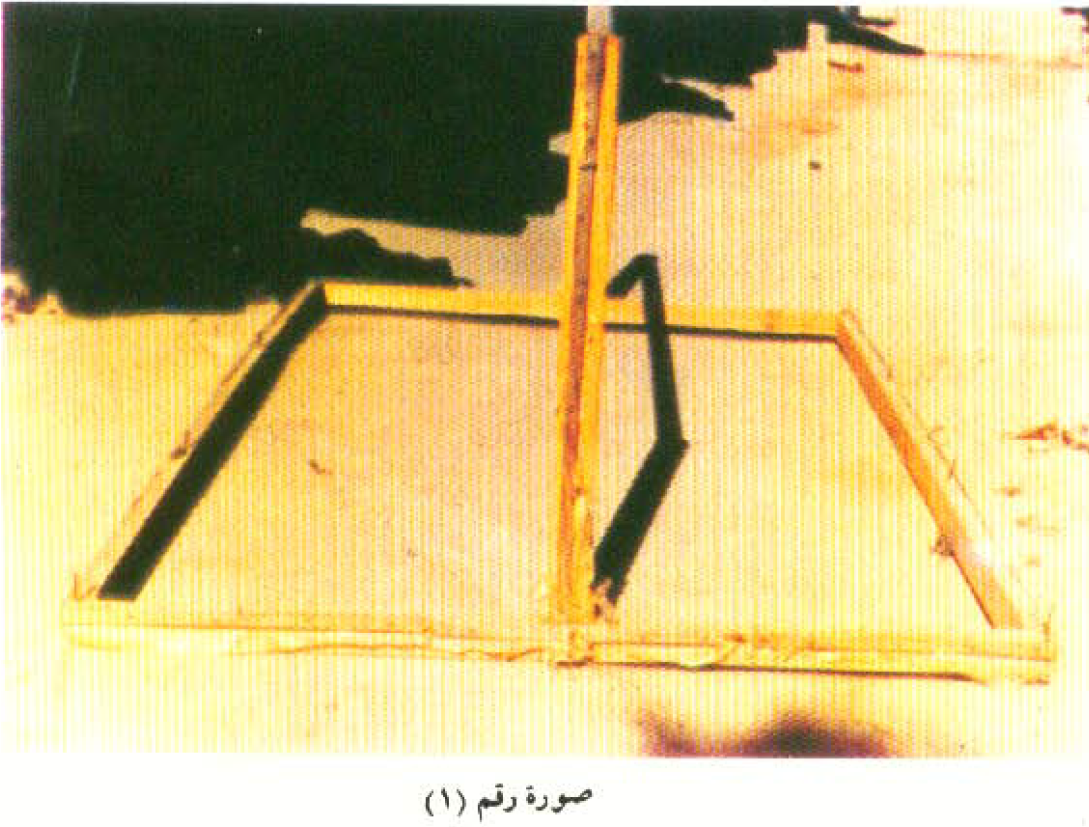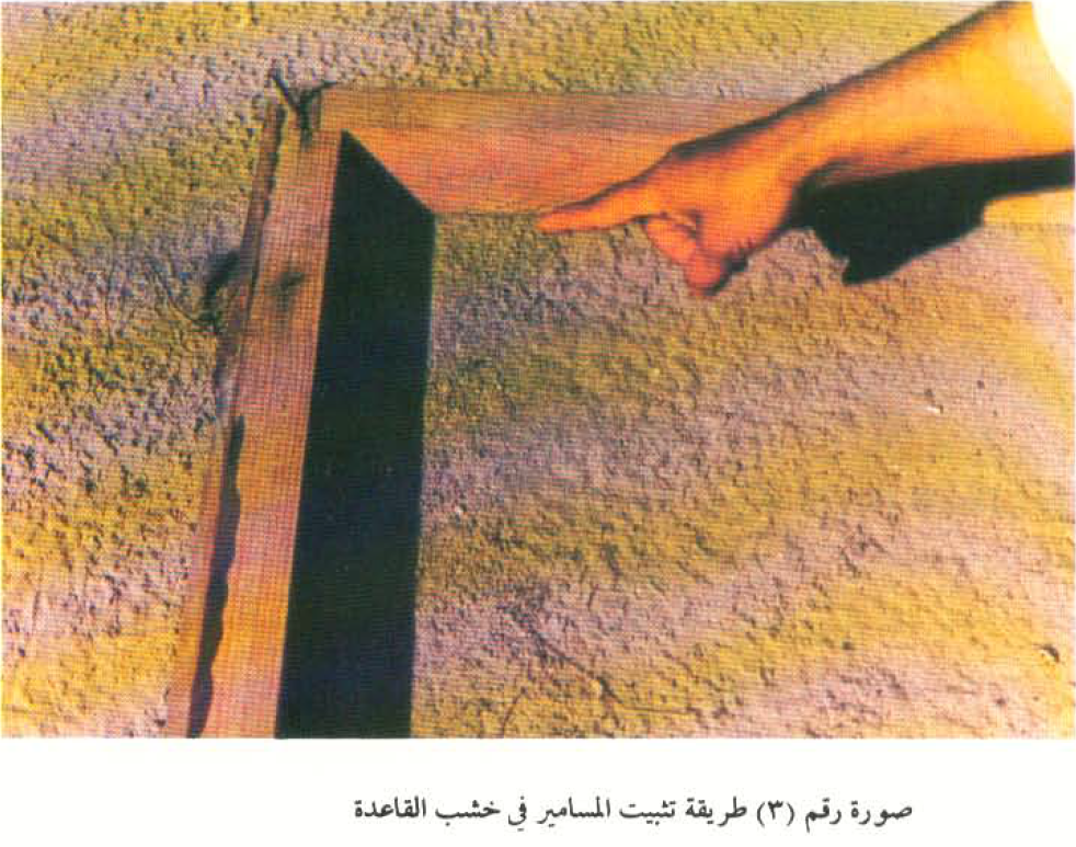 6ـ دق في كل جهة من قاعدة البيت الطولية اربعة مسامير بطول 15 سم وعلى بعد 1.33 م بين المسمار والاخر بحيث يترك 10 سم من كل مسمار بارزا فوق القاعدة لاستعمالها في تثبيت الانابيب صورة رقم (۳).
