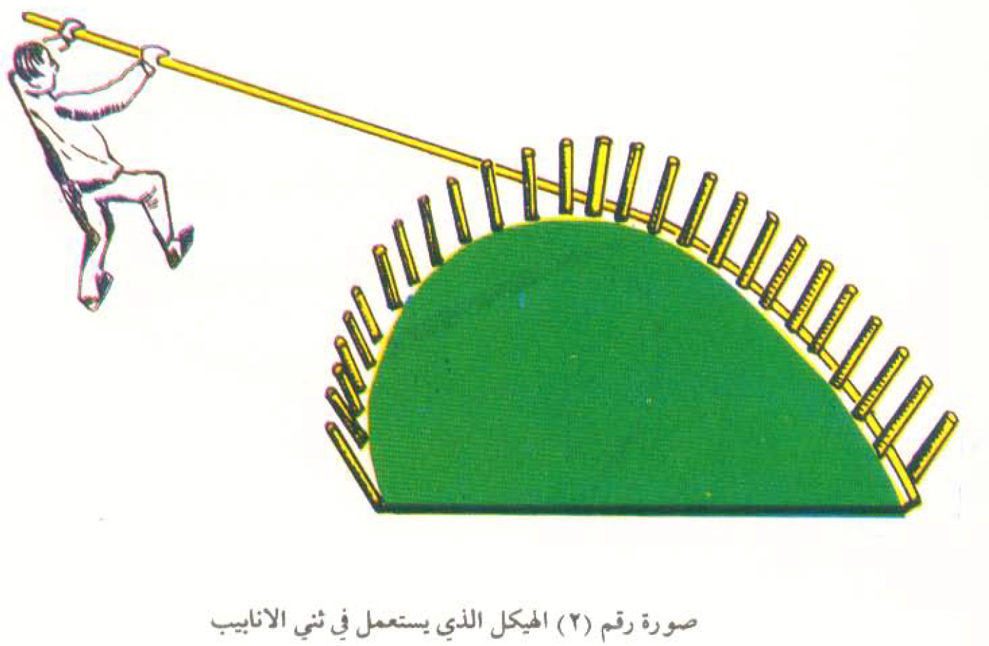 3- اثني اربعة انابيب من الانابيب المستقيمة والتي طولها 3م وقطرها 2/1 انش حول الهيكل صورة رقم 3 ، 4) وبذلك يمكن الحصول على اقواس بنصف قطر 100 سم وهو نصف القطر المطلوب.