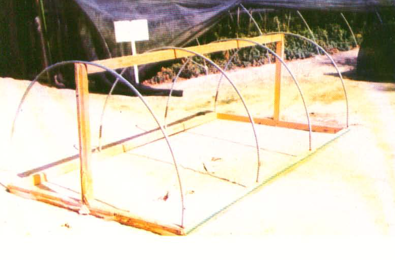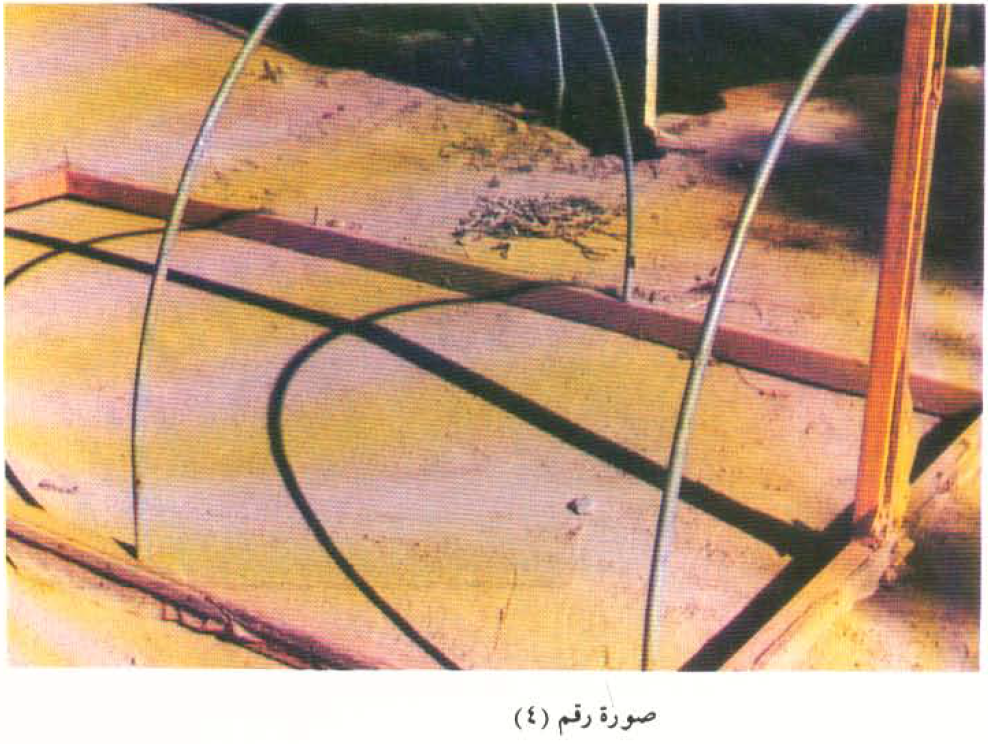 2- حضر الهيكل اللي سيستعمل في ثني انابيب البيت ويمكن عمل الهيكل الخاص بثني الانابيب بدق انابيب 2/1 انش طولها ۷۵ ،۹۰ سم في ارض صلبة علي ابعاد ۳۰ سم بين الواحدة والأخرى ويجب ان يكون نصف قطر الهيكل ۹۰ سم. (صورة رقم ۲).