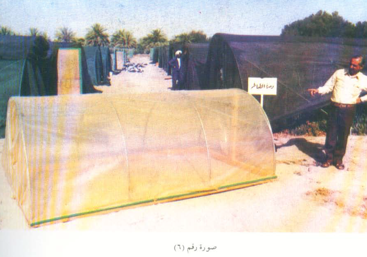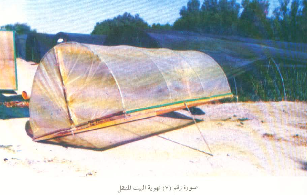 14 التهوية: ان تهوية البيت البلاستيكي المتنقل في غاية السهولة ويمكن اتمام عملية التهوية بوضع طابوق أو احجار كبيرة تحت زوايا قاعدة البيت (صورة رقم 7) أو برفع أحد طرفي البيت الى أعلى وركزها بمرينة خشبية.