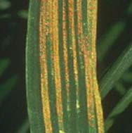 ظهور بثرات بارزة قليلا عن سطح الورقة لونها أصفر - دائرية الشكل- مرتبة في صفوف طولية موازية لمحور الورقة ولذا سمى بالصدأ المخطط. وتظهر البثرات على جميع أجزاء النبات (أوراق - سيقان - أغماد الأوراق- السنابل). وعند مسح الورقة المصابة باليد تترك أثار على هيئة مسحوق أصفر اللون.