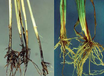 وتظهر الاعراض في صورة تلون بنى في المجموع الجذري ومنطقة التاج وعند اشتداد الإصابة يتحول إلى اللون الاسود وإصابة البادرات تؤدى إلى موتها وإصابة النبات البالغ تسبب جفاف السنابل قبل اكتمال العقد.