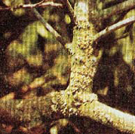 نموات حرشفية مختلفة الألوان (أو صدفية تميل إلى اللون الأصفر المخضر) على الأفرع والنموات الحديثة تزداد بزيادة الرطوبة.