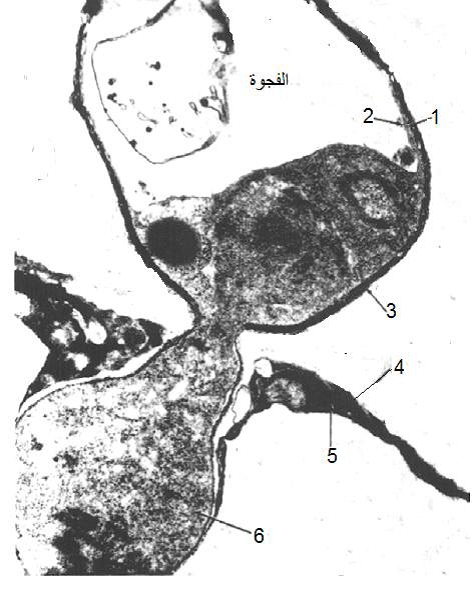 المفتاح : (1) اكتوبلازم البوغ المتكيس (2) تونوبلاست البوغ المتكيس (3) جدار البوغ السابح المتكيس (4) جدار خلية العائل (5) : سايتوبلازم خلية العائل (6) سايتوبلازم البوغ المتكيس.