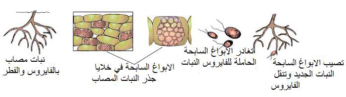 الشكل (1): الية نقل الفايروسات بالأبواغ السابحة Zoospores للفطريات الناقلة. الخطوات موضحة من اليسار إلى اليمين.