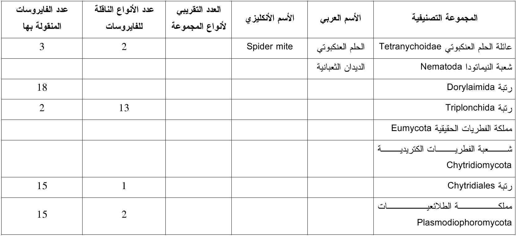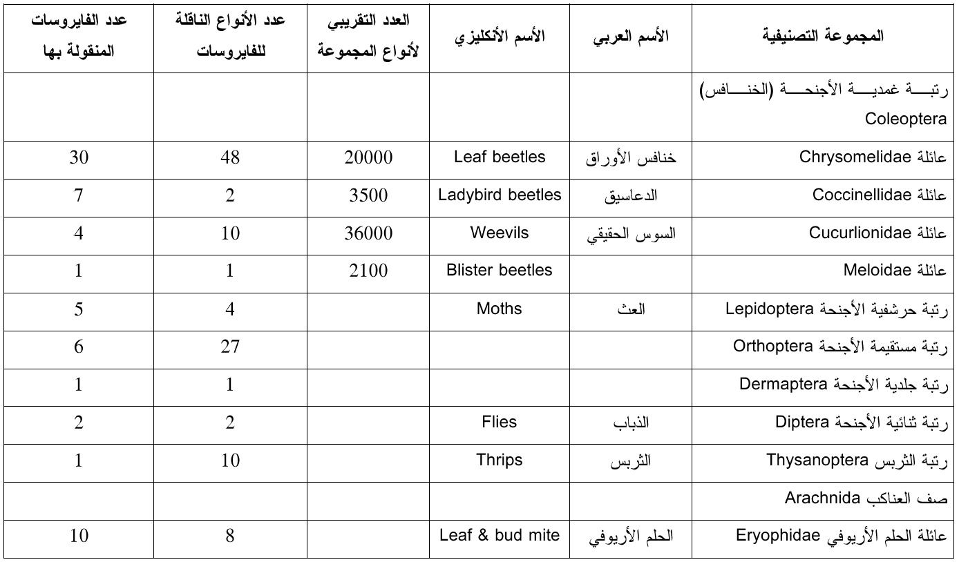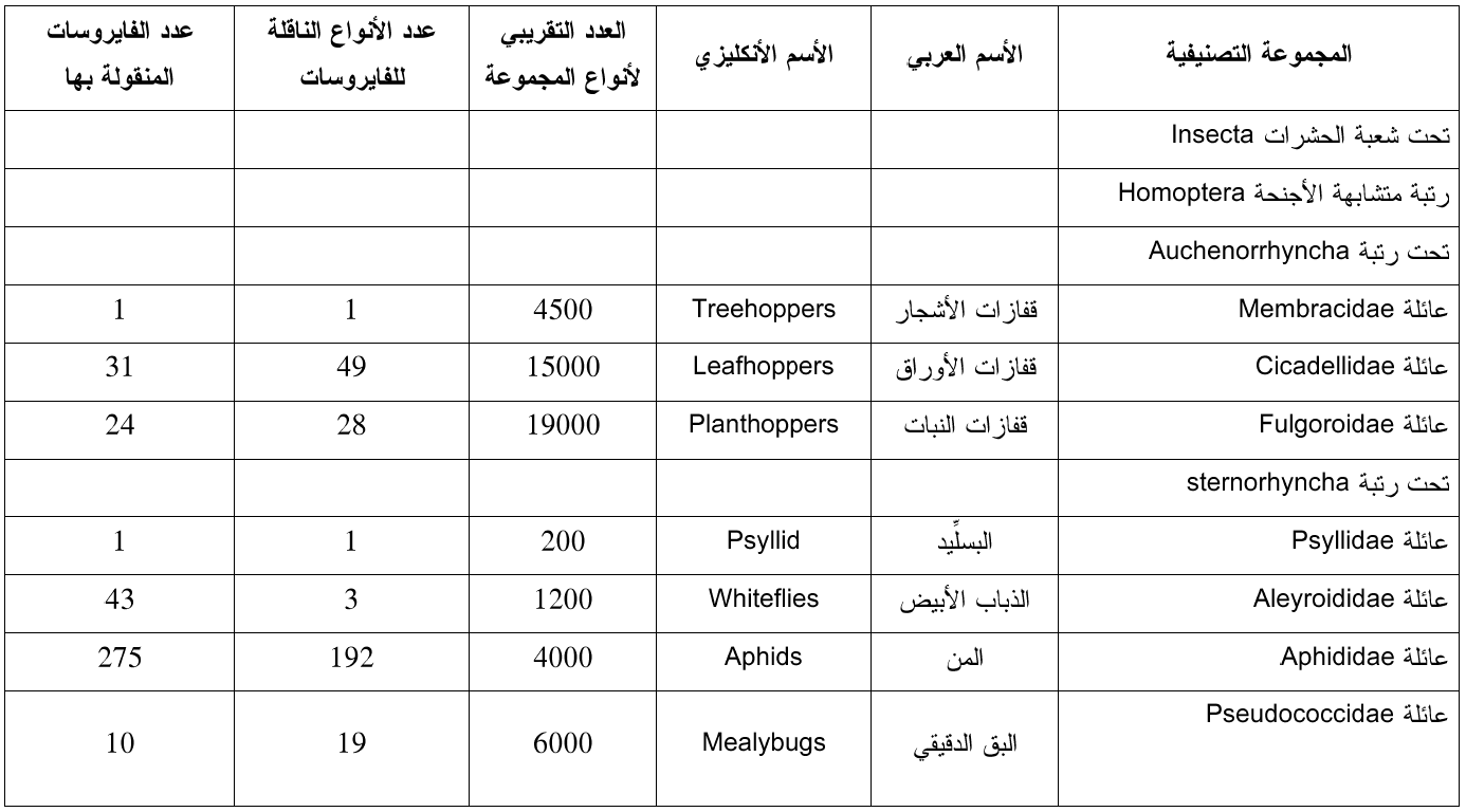 جدول يبين المجاميع التصنيفية لناقلات فايروسات النبات