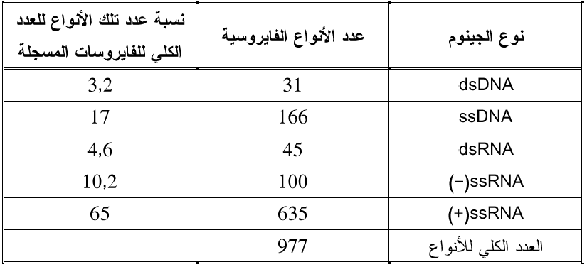 الجدول (2): أنواع الجينومات الفايروسية حسب توزيعها في الأنواع الفايروسية المسجلة