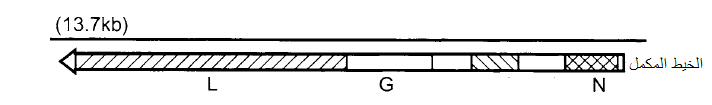 الشكل (6): التنظيم الجينومي لفايروس SYNV. يمثل الخط الأسود المتصل العلوي، الجينوم الأبوي السالب، أما السهم الأسفل فيشير إلى الخيط الموجب المكمل والذي يحمل المناطق التشفيرية (الجينات) ومنتجاتها البروتينية حيث يشير رأس السهم إلى النهاية 5.
