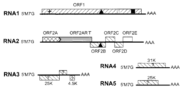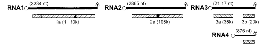 تشفر القطعتين RNA1 و RNA2 بروتيني إنزيم الربلكيز P1 وP2 وتشفر القطعة RNA3 بروتين الحركة MP وبروتي الكابسيد CP الذي تشفر جزءا منه أيضا القطعة RNA4، تمثل القطعة T/C جزءا من الجينوم بحجم 112 نيوكليوتايدة (nt) والتي تماثل في تركيبها الرنا المراسل Trna حجوم البروتينات التي تشفرها هذه القطع مبينة بالكيلو دالتون.