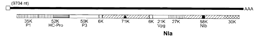 الشكل (7): التنظيم الجينومي لفايروس نقش التبغ (TEV). الخط الأسود العلوي يمثل الجينوم الفايروسي المفرد وعدد نيوكليوتايداته، فيما يوضح الخط الأسفل المناطق التشفيرية (الصناديق المظللة) وأنواع البروتينات التي تشفرها.