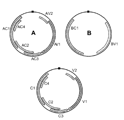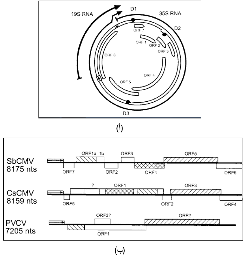 (أ) الجينوم الحلقي الفايروس موزائيك القرنابيط (CaMV) حيث تمثل الدوائر السوداء مواقع الفجوات D1 و D2 و D3 فيما تبين الصناديق الحاوية على الأسهم مواقع البواديء Promoters، وتمثل الصناديق الهلالية الطويلة داخل الدائرة الهياكل التشفيرية المفتوحة ORFs السبعة ويشير السهمين الغامقين خارج الدائرة إلى مواقع استنساخ نسخ الحامض الرايبي RNA transcripts وهما 35S و 19S.