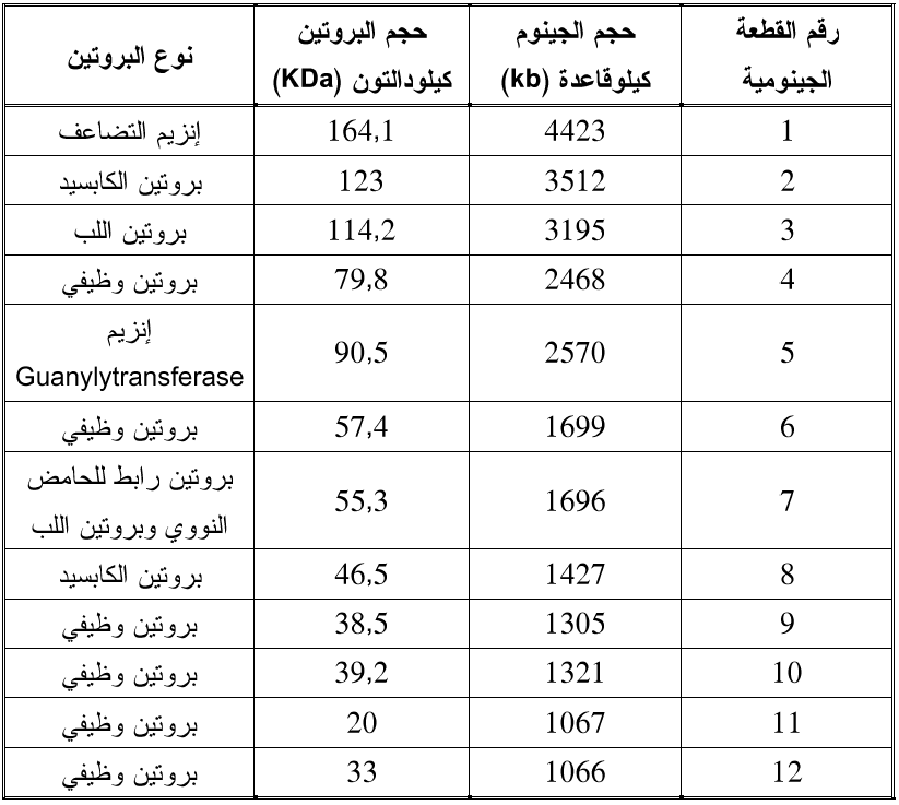 الجدول (1): خواص جينوم فايروس تقزم الرز (RDV) ووظائف قطعه الاثنا عشر